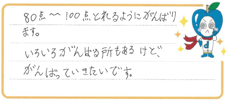 受験に向けて家庭教師を始めることになった3年生のK君。志望校も決まっているので目標の点数もありますが、あともう少し足りないという状況でした。今まで、過去の1.2年生の復習に手を付けられていないようでしたが、今後は家庭教師の先生が受験に向けて1.2年生の復習も含めた勉強のやり方を教えていきます。高校受験に向けてあと半年程度、気を抜かないように一緒にがんばっていきましょう!