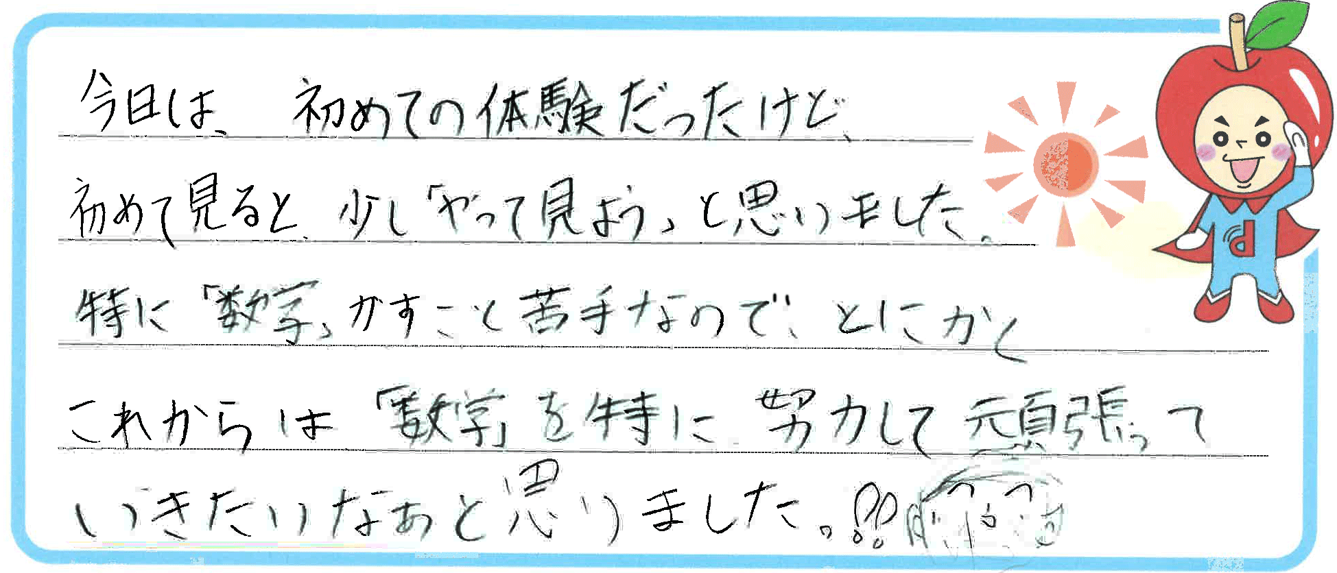 とても元気で真面目な子でした。今までやり方がつかめていなかっただけなので、やり方さえつかめれば必ず伸びると思います!!