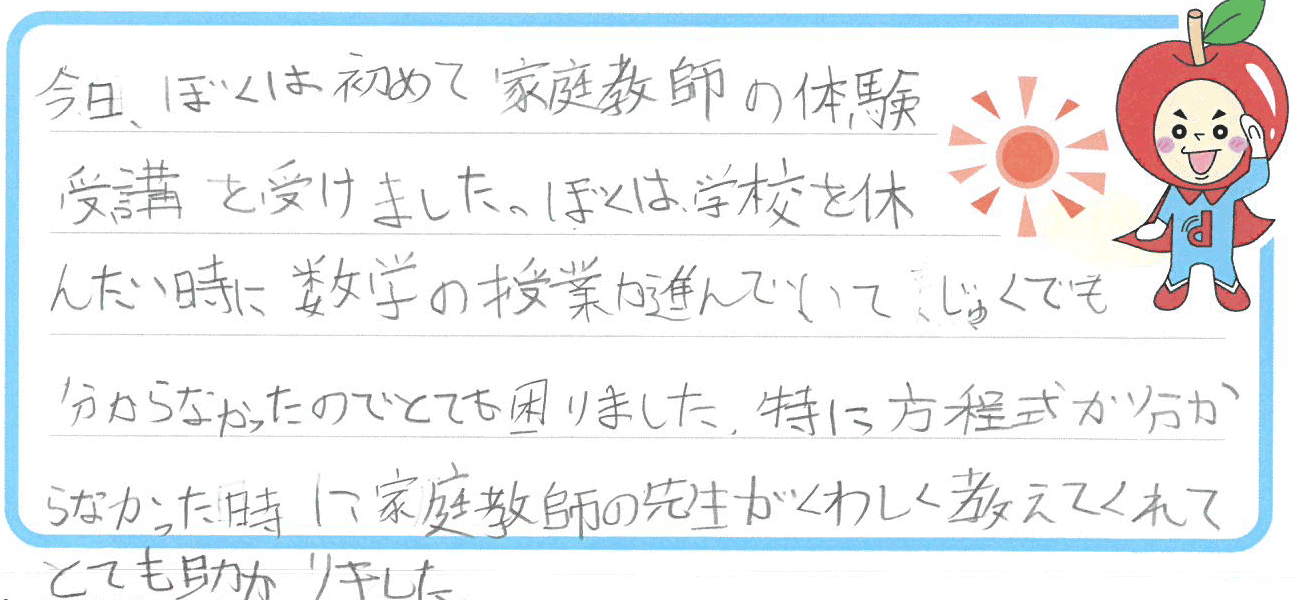 「学校の授業より、分かりやすい!」と、無料体験学習を受けて言っていくれた、大牟田市のA君。これから家庭教師と、苦手な科目を克服できるように、一緒に頑張りましょう!