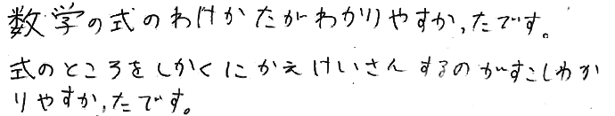 塾に通っていましたが、なかなか成果が出ないというT君に家庭教師の体験授業を受けていただきました!1対1だとわからないところもすぐに質問出来て理解しやすいと、気に入ってくれた様子^^これから家庭教師で一緒に頑張っていくことになりました!T君のペースで進めていこうね!