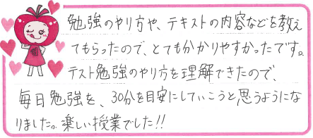無料体験では、実際に勉強を教えるだけでなく、勉強のやり方やテスト対策のコツなども教える事で京都市のご家庭に喜んでいただいています。
