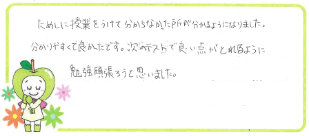 部活の練習が忙しくて、勉強との両立に悩んでいた京都市左京区の中学校に通う2年生のK君。塾だと家から遠いのと、授業時間に間に合わないので、スケジュールの融通が利く家庭教師の方が自分には合っていると、デスクスタイルに入会を決められました。これから先生が、忙しいK君でも、家での勉強も効率良くすすめていけるように、サポートしていくから、一緒に成績アップ目指して、コツコツ頑張っていこう!