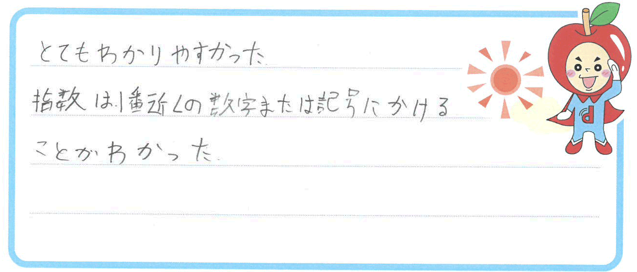 中学生になって勉強の内容がどんどん難しくなり、成績が下がってきていると悩んでいた長崎市の中学校に通う1年生のHちゃん。来年度から2年生になって今よりももっと勉強が難しくなってくるので、自分に合った勉強方法を探すために今回体験授業を受けてみようという事になりました。塾も検討していたようですが、実際に体験授業を受けてみて「デスクスタイルの家庭教師の先生は1対1で熱心に指導してくれて、指導がない日もこの料金で学習習慣をサポートしてくれるのは安い!」と言っていただきました。これからは家庭教師の先生が指導がない日もしっかりと家で勉強ができるようにサポートしていくので、はるかちゃんは出された課題はしっかりと取り組んで、成績アップ目指して一緒に頑張っていこうね!