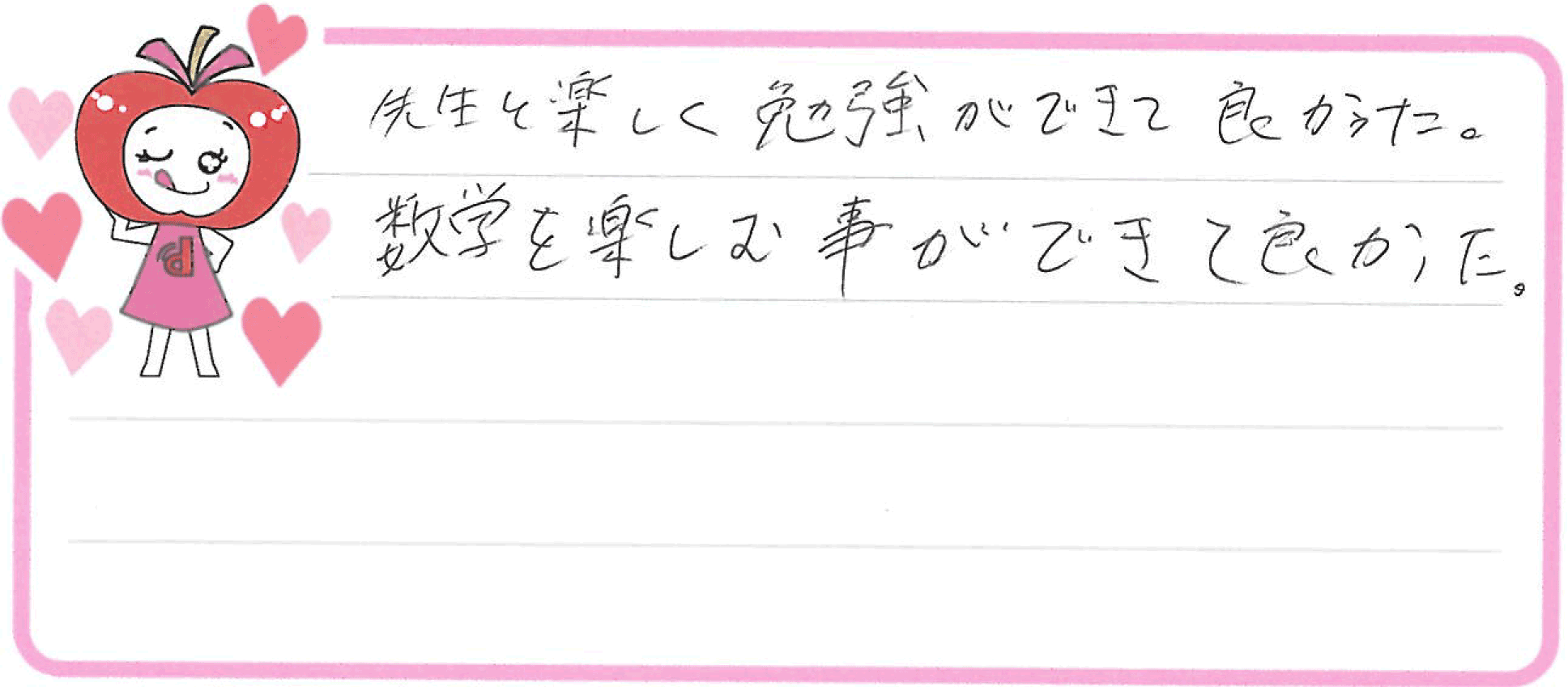 「勉強のやり方が分からない・・・」と悩みを抱えていた、長岡市のAちゃん。でも無料体験学習を受けて、「これなら出来そう!」とやる気になってくれたね。これからデスクスタイルの家庭教師が、基礎からサポートしていくよ。一緒に頑張ろう!