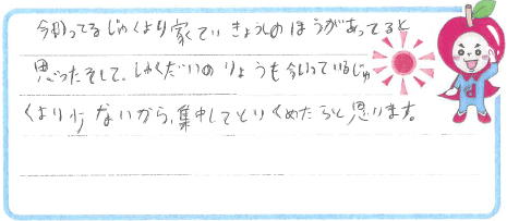 指導のない日の家庭学習の方法が分からないという生徒さんでしたので、最初の方は具体的にどの科目のどんな単元をやるのか明確にしてから、宿題などを出すようにしています。宿題は生徒さんがどこまで頑張って問題に取り組みたいのかその都度聞いて最後まで解くことが出来ていなくてもその過程を褒めるように意識しています。