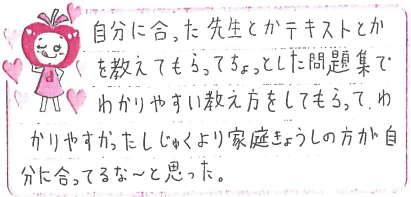 小学校の頃から塾に通っていたけど、中学生になってから成績が思うように伸びず悩んでいた中学1年生のMちゃん。今回家庭教師は初めてでどんな先生が派遣されるか緊張して待っていてくれました。実際に体験を受けてみて「塾は集団だけど、家庭教師は1対1だから自分のペースで勉強出来て分かりやすかった!」と勉強に前向きになって入会を決めてくれました。これから先生と一緒に勉強のコツを掴んで成績アップできるよう頑張っていこう!