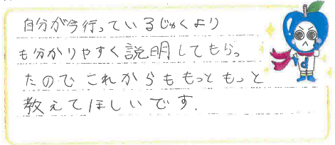 指導のある日は、学校で習ったところ(理解できなかったところを中心に)をもう一度簡単に確認してから、学校の進み具合に合わせて予習するようにしています。勉強がかなり苦手な生徒さんなので、解説の時は丁寧にわかりやすく話すように意識しています。長期休みに入った時は、苦手なところを中心に戻り学習をしています。
