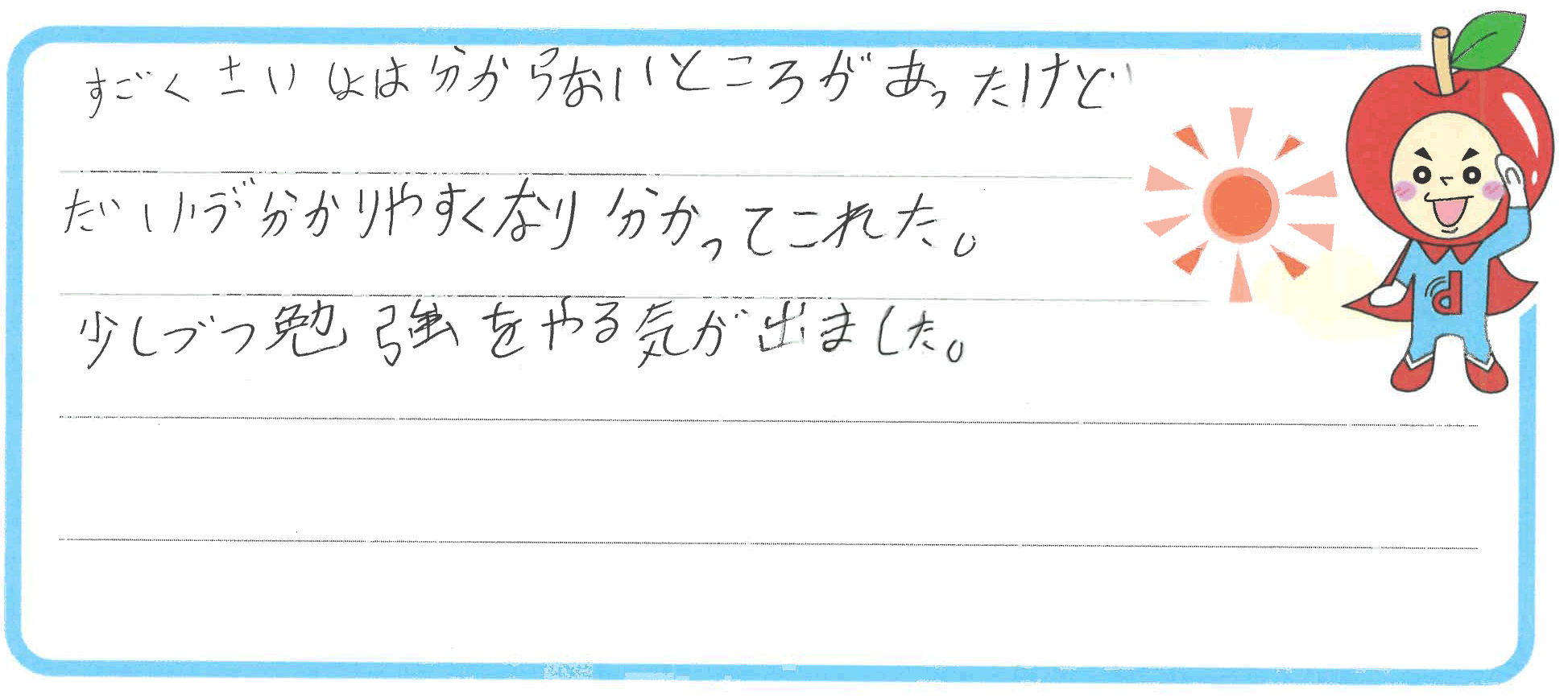 部活でバレーボールを頑張っている、ひなちゃん。最初は家庭教師が初めてで緊張している様子でしたが、真剣に最後まで話を聞いてくれたね!勉強のやり方がわかったようで、やる気になってくれて良かったです。これから一緒に頑張ろう!