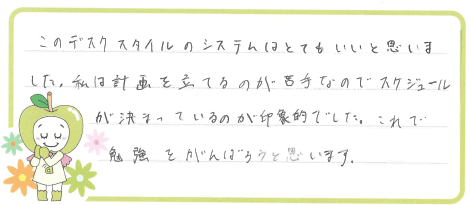 集団塾に入ったものの、だんだんついていけなくなっていた魚津市のNちゃん。何か違う方法がないかと探していたところ、デスクスタイルの無料体験にたどり着きました!1対1で毎回同じ先生に教われるのが、Nちゃんには合っていそうということで入会していただきました。これからは、分からないところは家庭教師の先生が来た時に質問して遅れを取り戻していこうね!